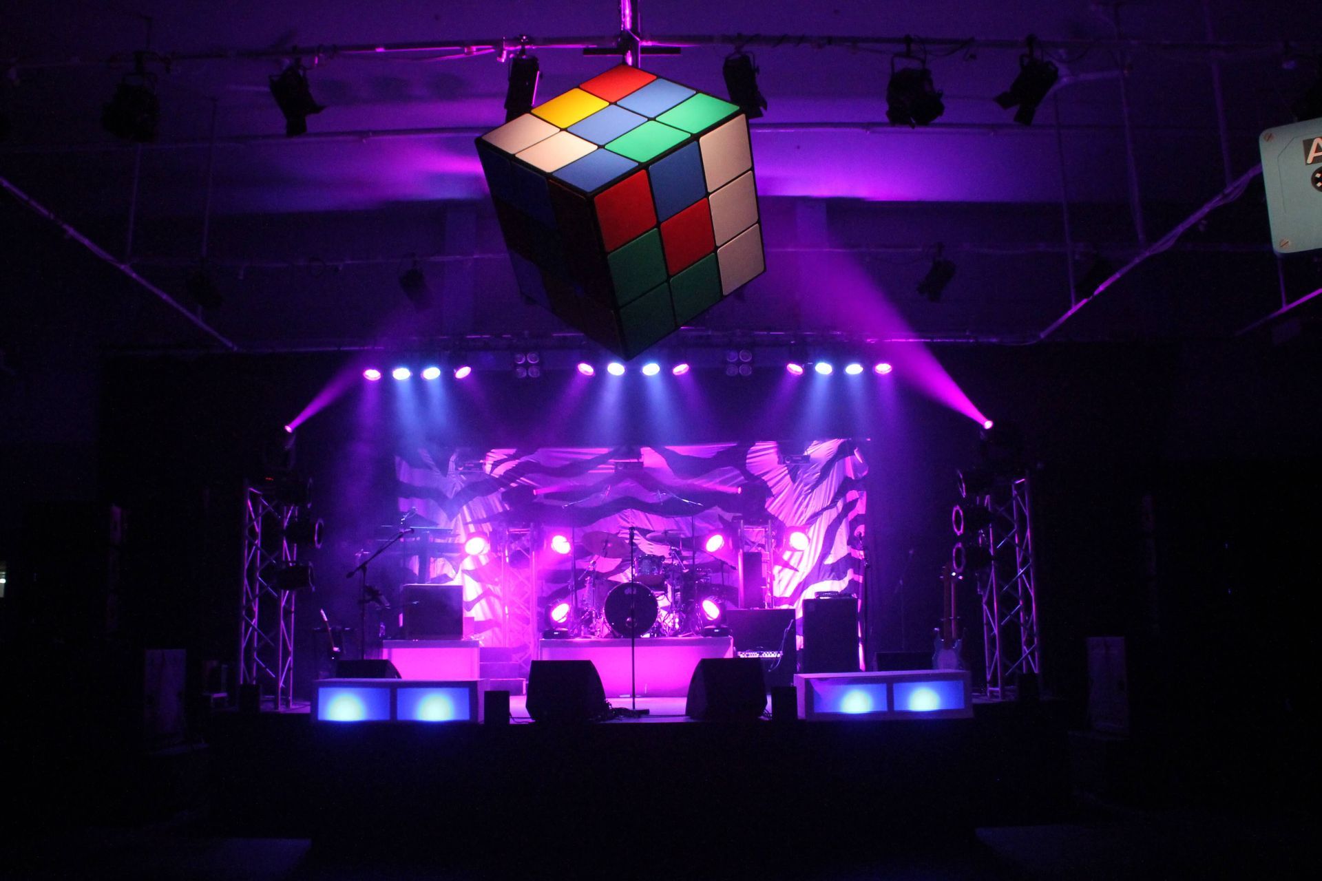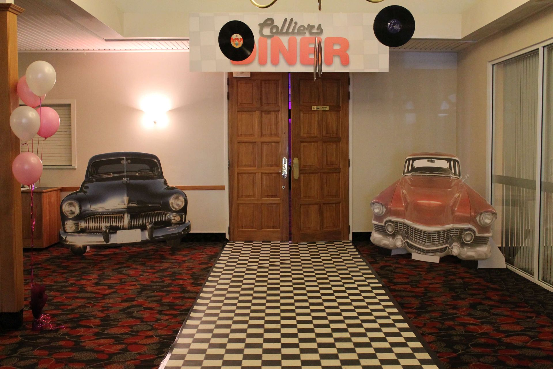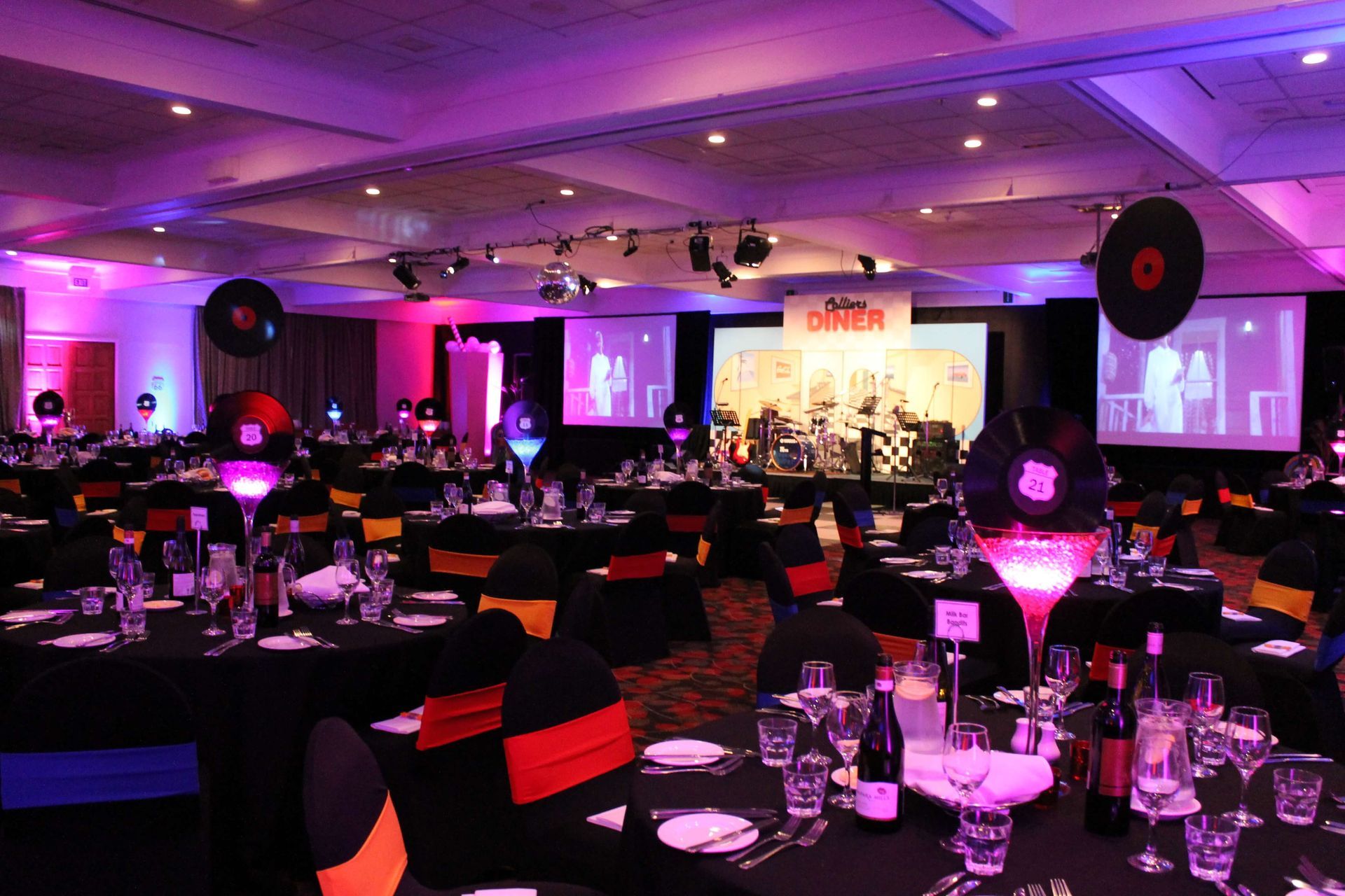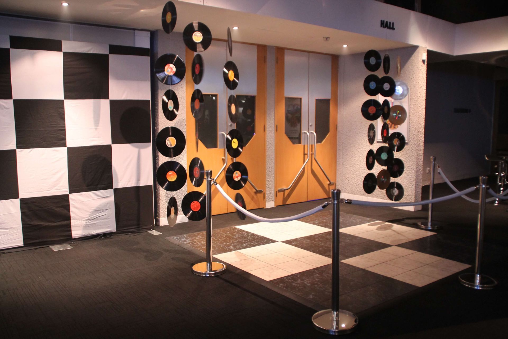 A black, red, silver and metallic colour palette with touch’s of neon will create atmosphere. Then feature props such as guitars, music notes and bright up lighting will create an electric atmosphere, for your guests to dance the night away on the black and white checkered dance floor.