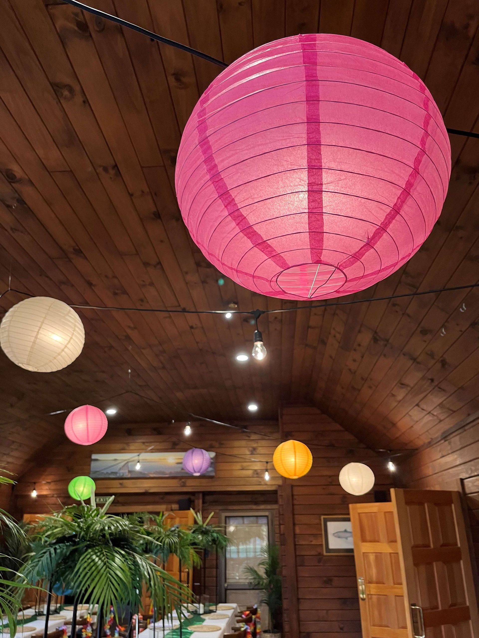 Picture a tiki bar, palm trees, floral leis, bamboo and lush floral décor setting the scene for a relaxed yet festive atmosphere. A vibrant tropical palette of coral, turquoise, sunny yellow, lush green, and ocean blue sets the scene, brought to life with colourful paper lanterns hanging overhead.