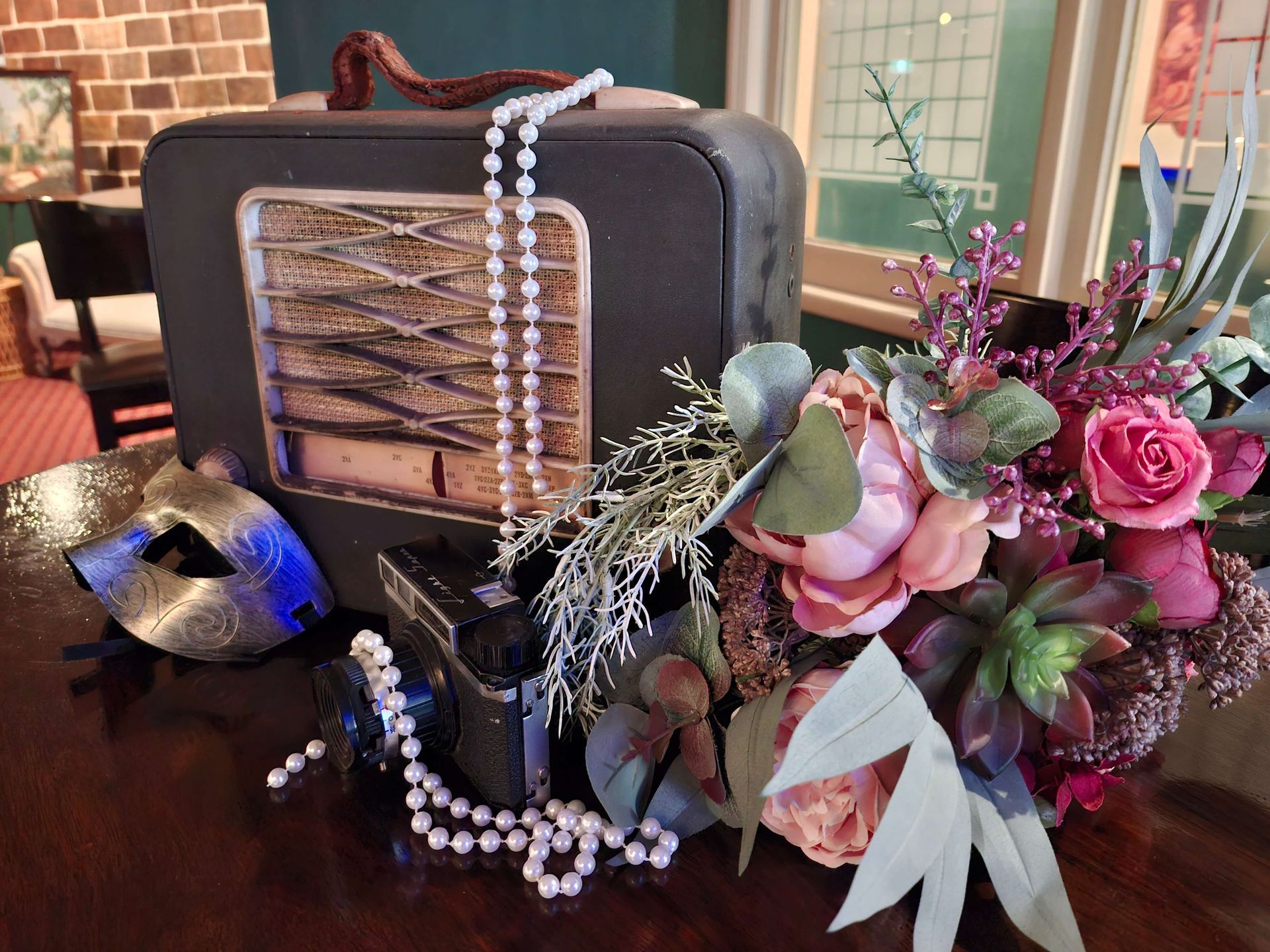 The air is filled with the scent of fresh flowers tucked into teapots, and the sound of soft jazz floats through the room, setting the tone for an unforgettable night of op shop elegance.